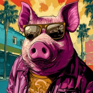 «Moonpig, in the style of a Grand Theft Auto loading screen artwo...»