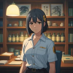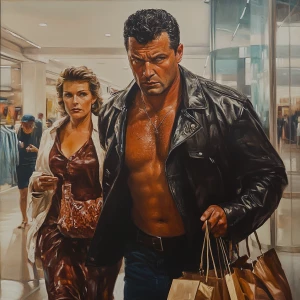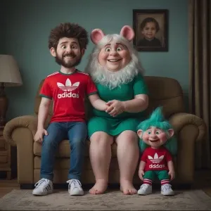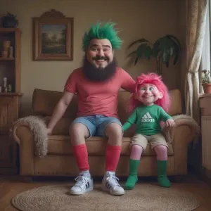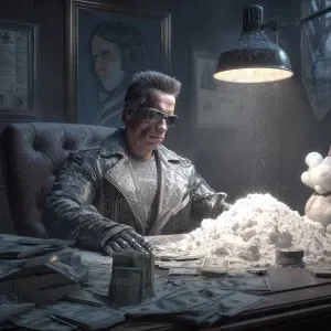 «fan art of T-800 Smurf setting behind a desk with white powder...»