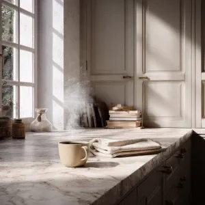 «Create an elegant kitchen setting featuring a marble countertop...»
