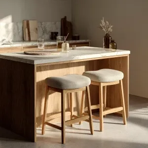 «Create a serene coastal kitchen scene featuring rattan bar stool...»