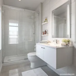«Create a realistic image of a small modern bathroom in an all-wh...»