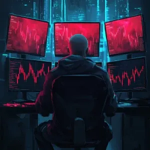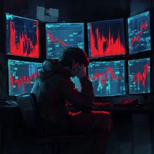 «a sad Wojak character sitting in front of multiple monitors with...»