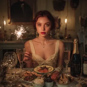 «A elegant woman sitting at a beautifully arranged New Year's din...»