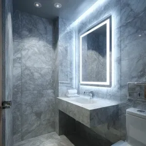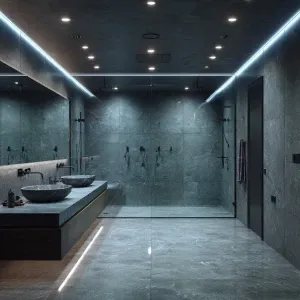 «Generate a realistic image of a spacious and luxurious grey marb...»