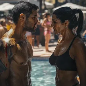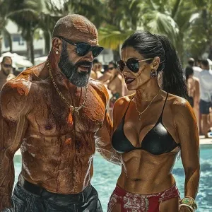 «PhotoRealism,realism,a muscular beefy sweaty man walking with h...»
