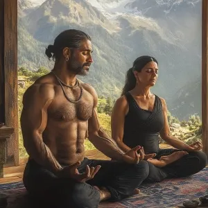 «Photorealism,realism,A man muscular beefy sweaty doinga yoga sit...»