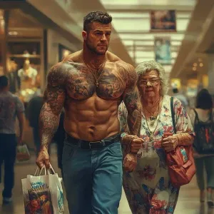 «Photorealism,fantasy,a man beefy muscular criminal tattoed walki...»