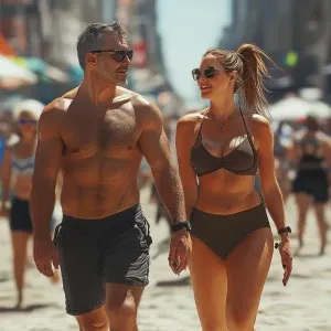 «Create a photorealistic image of a muscular, perspiring man walk...»