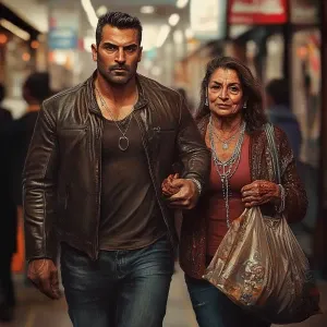 «Photorealism,fantasy,a bodybuilder man ,walking with his 50 year...»