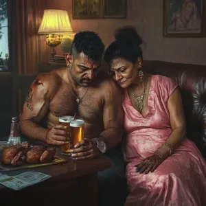 «Photorealism,fantasy.A sweaty beefy man walking with his 54 year...»