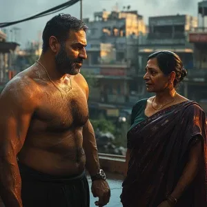 «Realism,a muscular sweaty man walking with his 50 years old poo...»