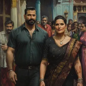 «Photorealism,realism style,a muscular beefy criminal man walking...»