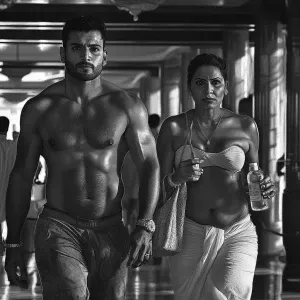 «photorealism,realism style,A sweaty tattoed muscular man walkin...»