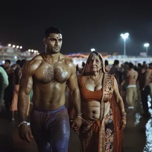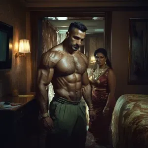 «Photo,realism.A gujarati muscular man sweat on body walking with...»