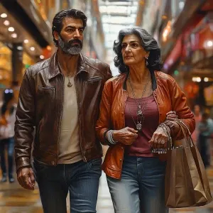 «realism,a bodybuilder man ,walking with his 50 years old attract...»