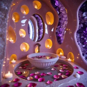 «Bathroom 3 — Rose Quartz Grotto: A grotto-like sanctuary carved...»