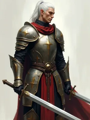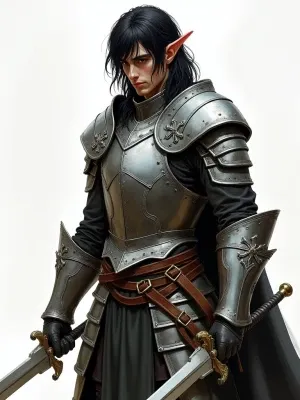 «A male half-elf with black hair donned in gleaming metal plate a...»