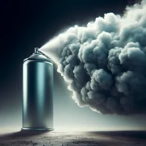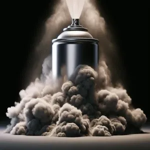 «Create a hyper-realistic image of an oversized spray can releasi...»