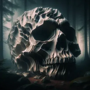 «Macro photography. A cracked boulder forms a sad skull face in a...»