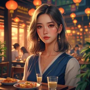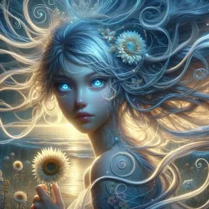 «"Portrait of a young girl with long curly hair, wearing a summer...»