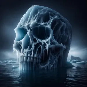 «Macro photography. A cracked iceberg forms a sad skull face in a...»