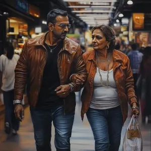 «Photorealism,a bodybuilder man ,walking with his 50 years old at...»