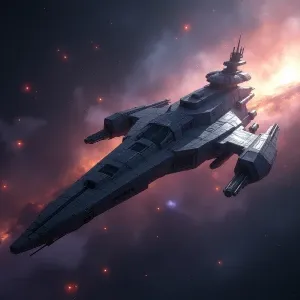 «A towering, sleek space explorer, its armor gleaming in the hars...»
