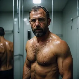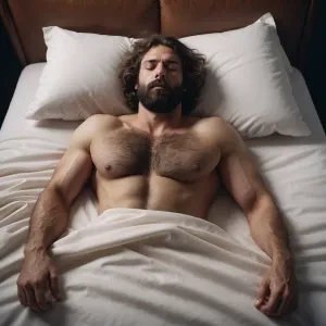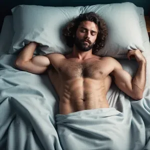 «Create an image of a muscular and hairy father sleeping peaceful...»