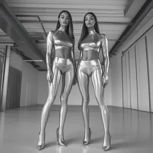 «Two muscular women standing side by side, wearing tight shiny sa...»