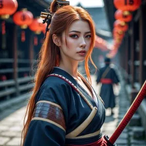 «Wide angle long shot camera redhead woman samurai warrior»