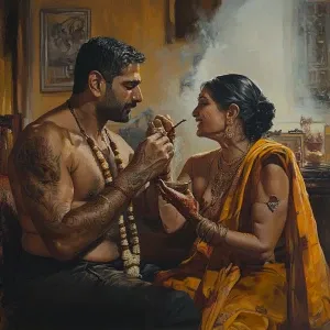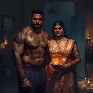 «Realism ,sharp art.a muscular sweaty criminal celebrating diwali...»