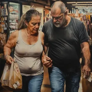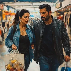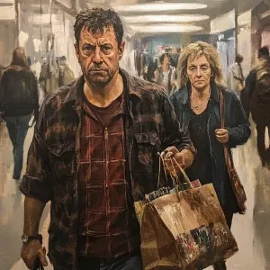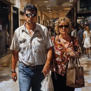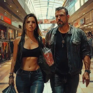 «Realism art,a man(beefy muscular criminal)walking(shopping)with...»
