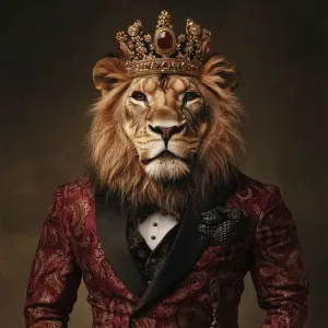 «A majestic lion stands as the focal point, crowned with a luxuri...»