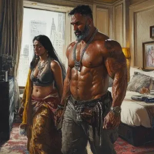 «Create a hyper-realistic image of a muscular, sweaty man enterin...»