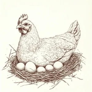 «Pen and ink chicken laying on a bed of straw containing eggs und...»