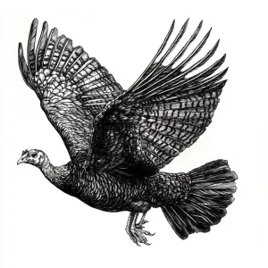 «Pen and ink drawing of a turkey flying, the view is from the sid...»