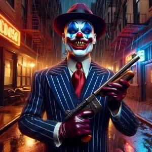 «A towering, grotesque Mafia boss clown. His oversized, crimson-p...»