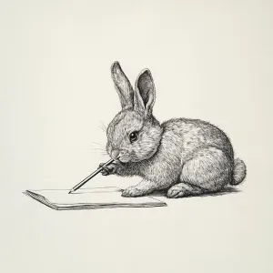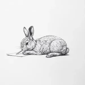 «Pen and ink drawing of a bunny positioned on his belly with his...»