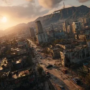 «A low street view wide-angle, cinematic shot of a dystopian Los...»