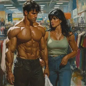 «Realism art, a muscular, sweaty hotty man walking alongside his...»