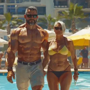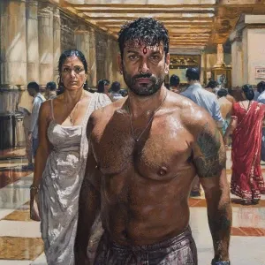 «Realism art,A muscular man, glistening with sweat, walks with hi...»