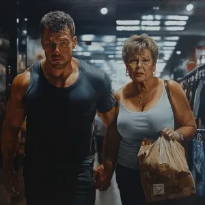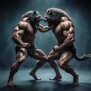 «Photorealism painting.A muscular, sweaty man walking with his 43...»