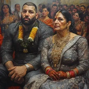 «Realism sharp detailed painting.A sweaty beefy man walking with...»