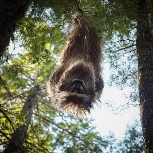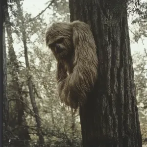 «A humanoid looking hair covered sasquatch hanging upside-down hi...»