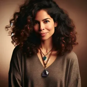 «Image of a woman with warm, light brown skin and medium brown, v...»