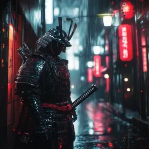«Dramatic splash art. A lone cyberpunk samurai stands defiantly i...»