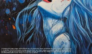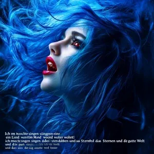 «A woman with long blue hair and red eyes singing "Ich möchte sin...»