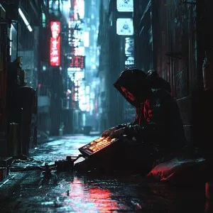 «Dramatic splash art. A lone cyberpunk hacker sits hunched over a...»