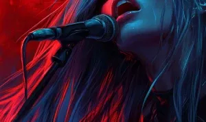 «A woman with long blue hair and red eyes singing, super detailed...»