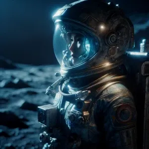 «In the dimly lit lunar cavern, a hyper-realistic moon miner stan...»
